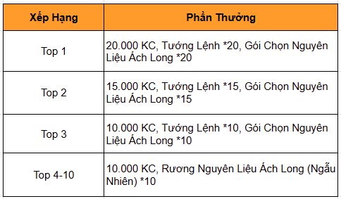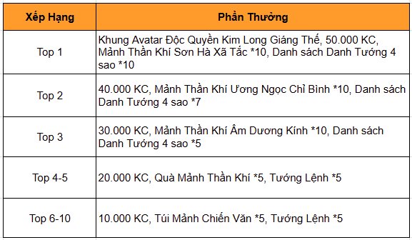 - 10 người chơi đạt cấp độ cao nhất server sẽ nhận được phần thưởng tương ứng. Nếu bằng cấp độ, ưu tiên người lên cấp sớm hơn.